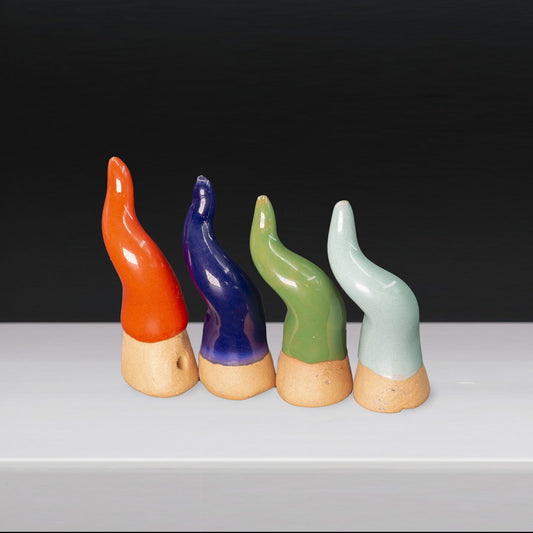 Mini ceramic countertop horn, assorted colors, in a pyramid box with graphite