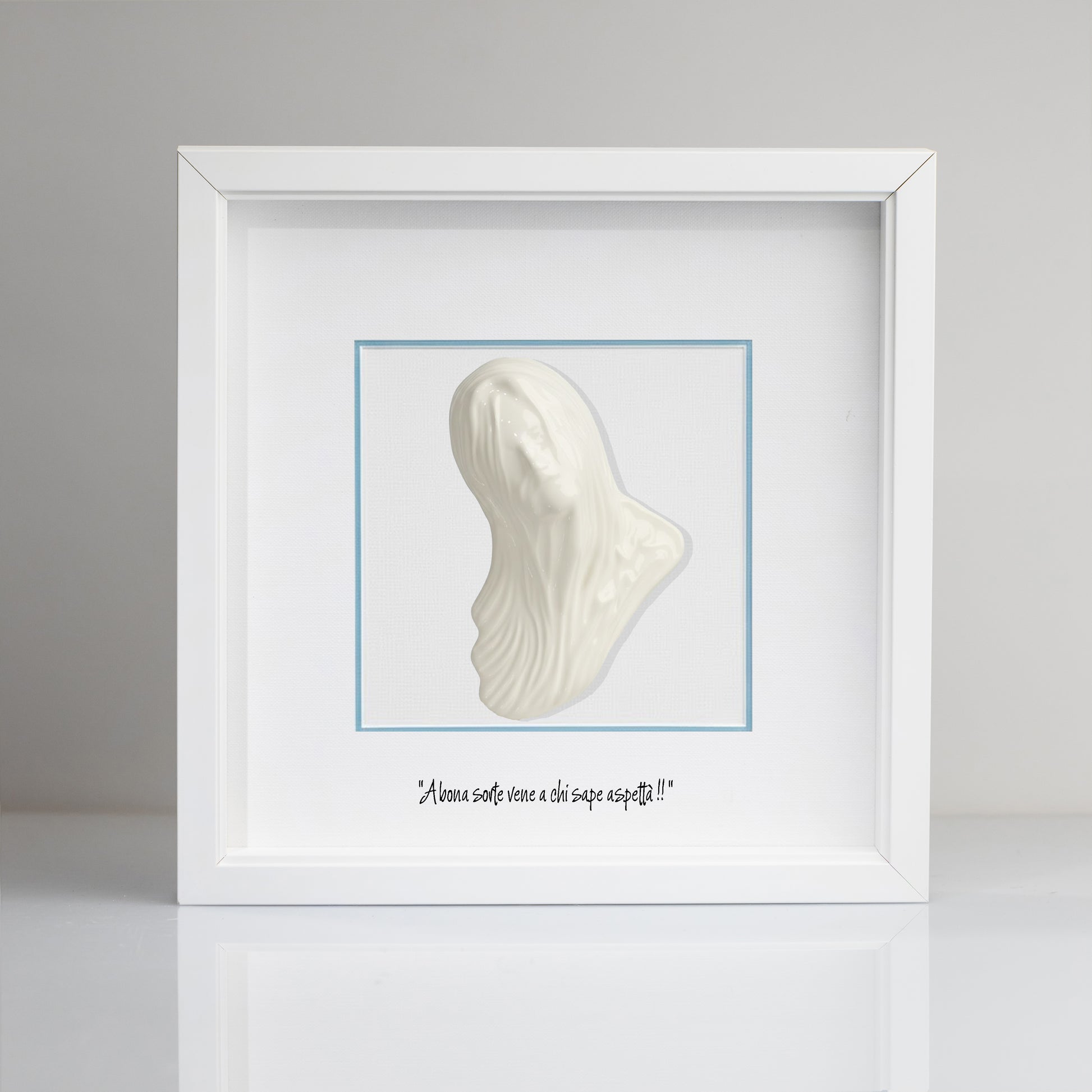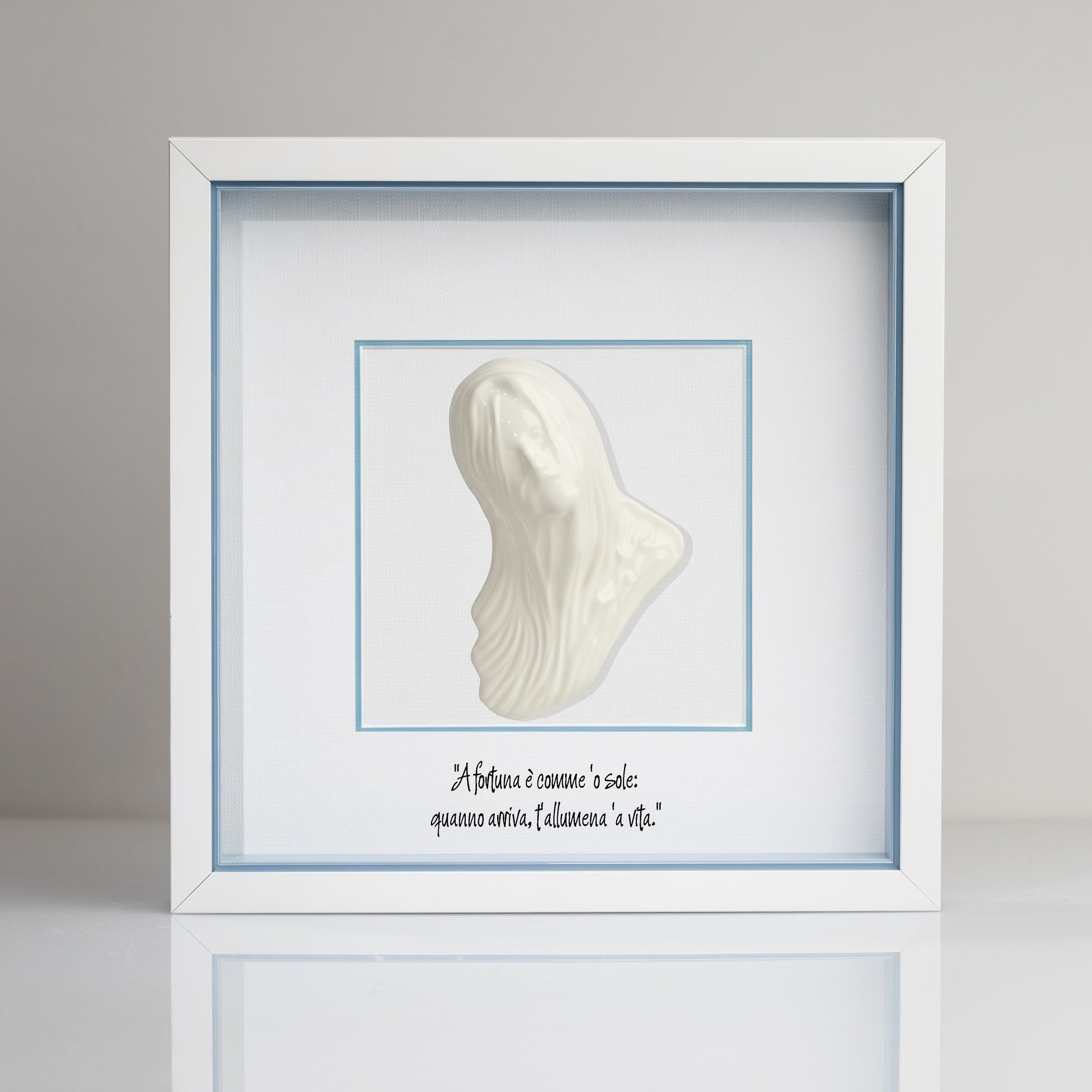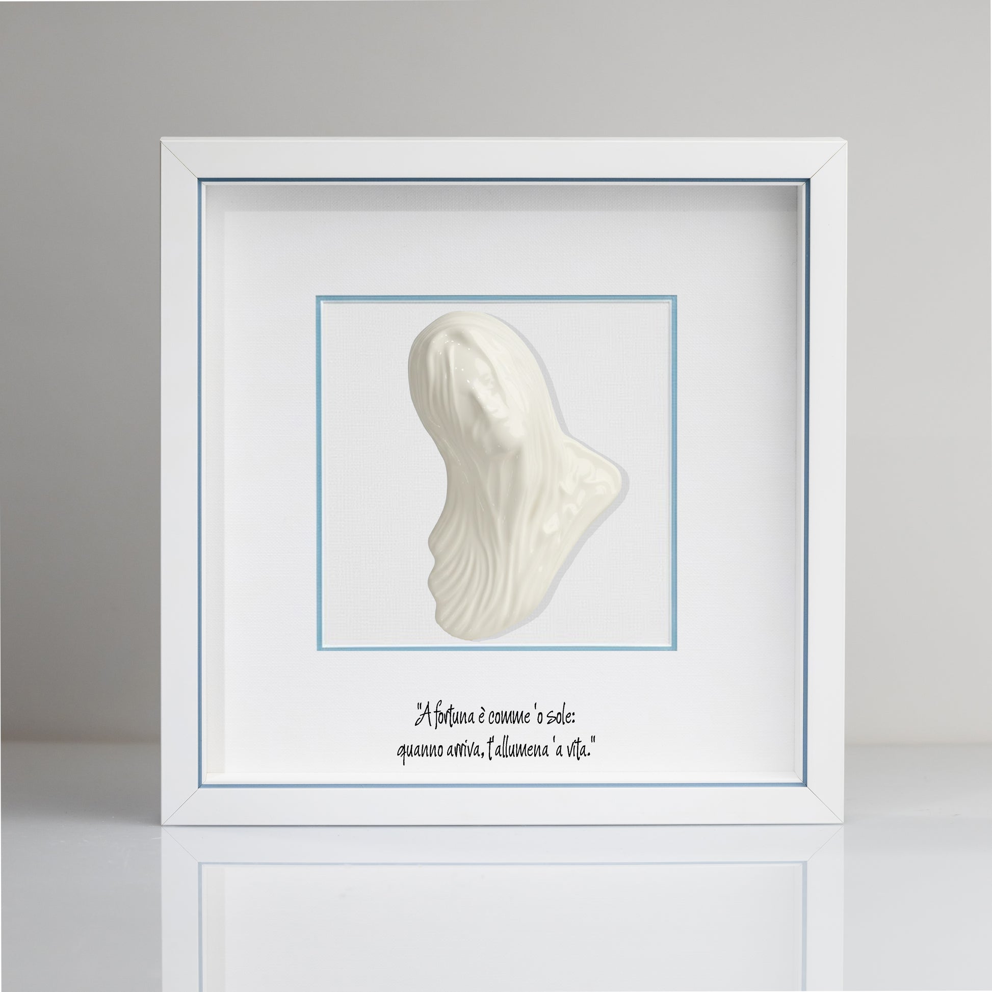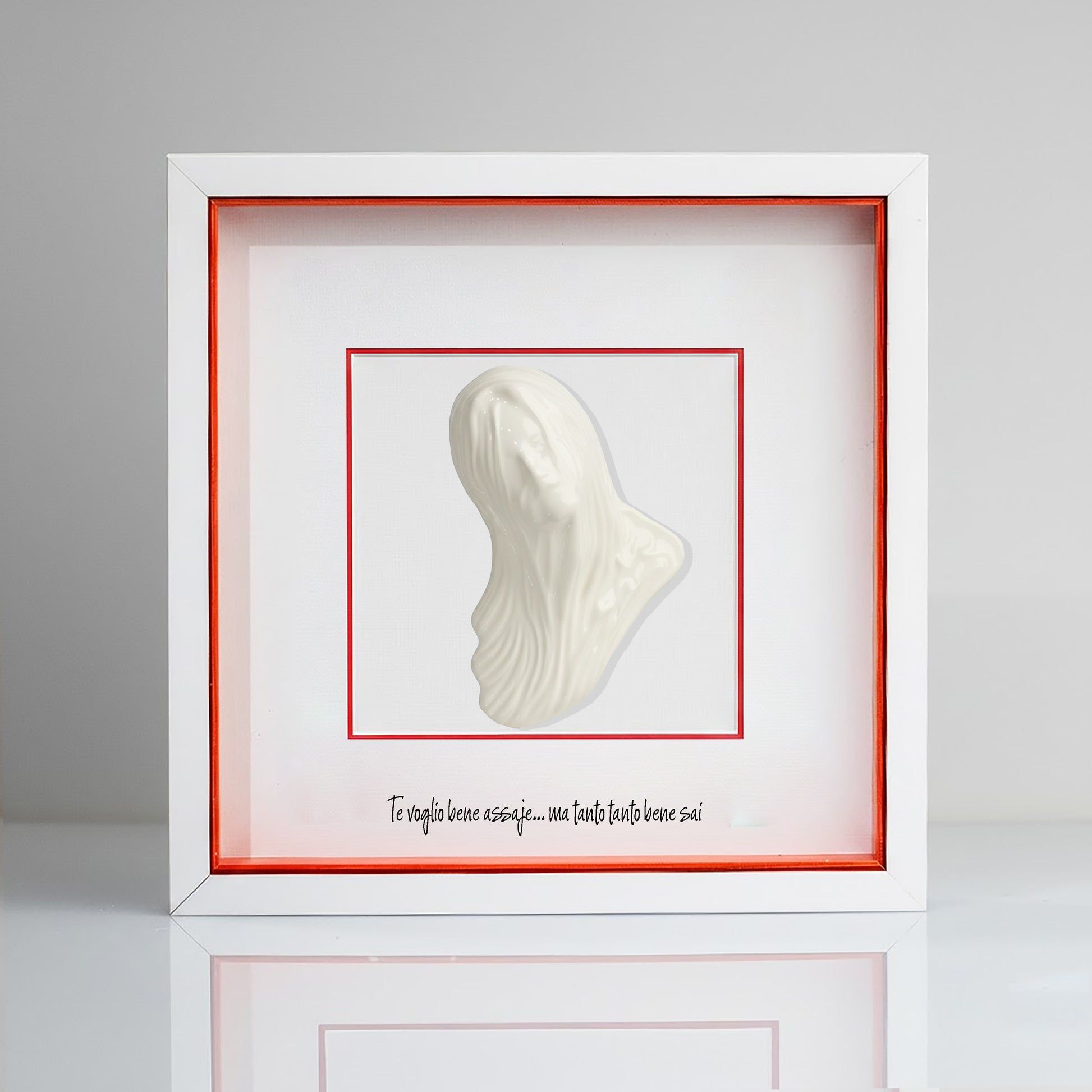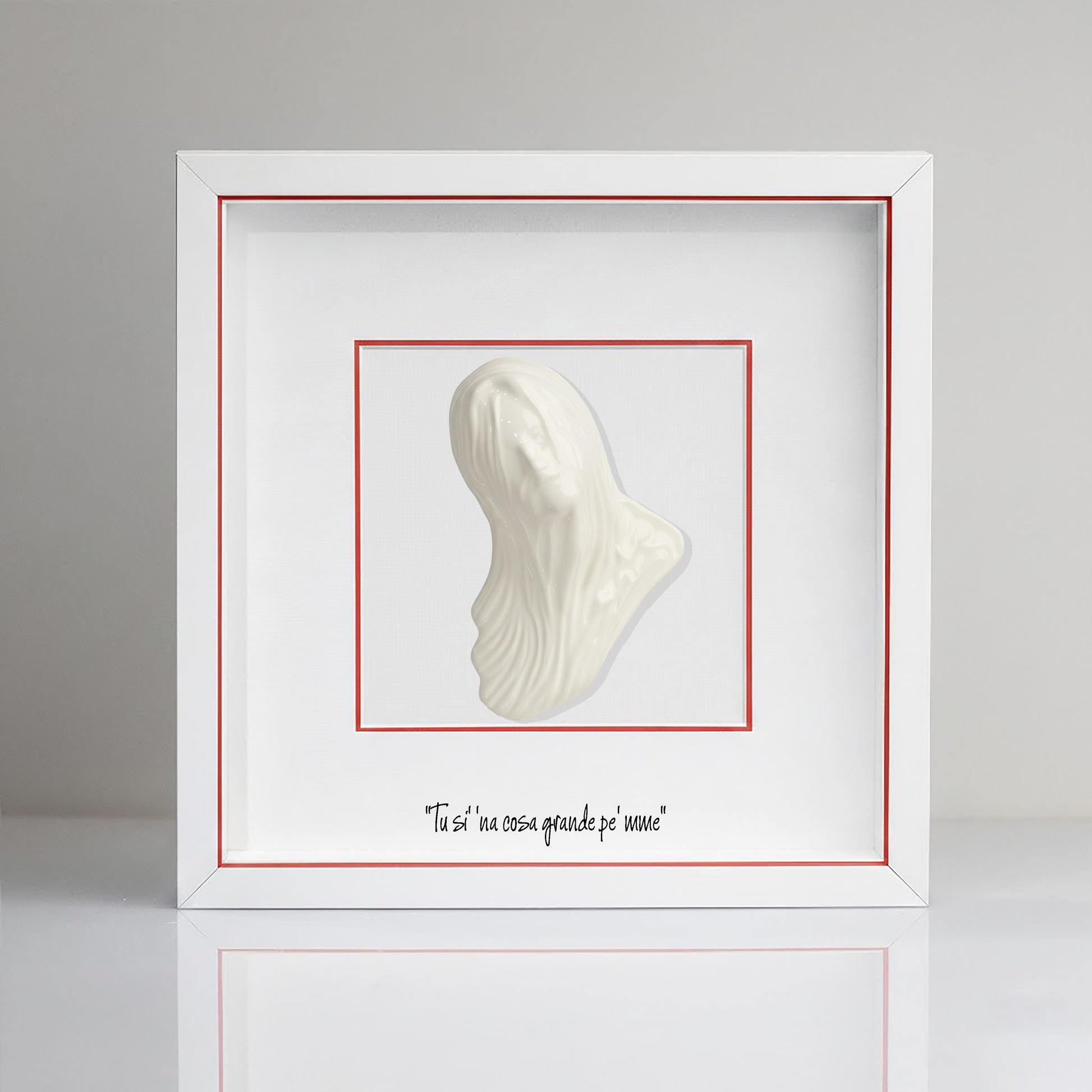 This elegant, handcrafted decorative object depicts a red ceramic Bella Mbriana, a symbol of Neapolitan tradition. The silver fir wood frame elegantly frames it, creating a work of art worthy of display. Accompanied by an iconic Neapolitan phrase, this unique piece is a must-have for lovers of craftsmanship and local traditions. A precious gift to treasure, housed in a refined case. Dimensions: 23 x 23 cm