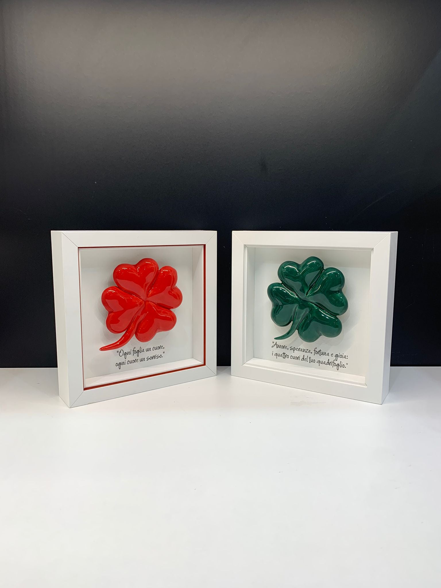 🌿 Cornice in legno con quadrifoglio in ceramica colore rosso – simbolo di fortuna e amore