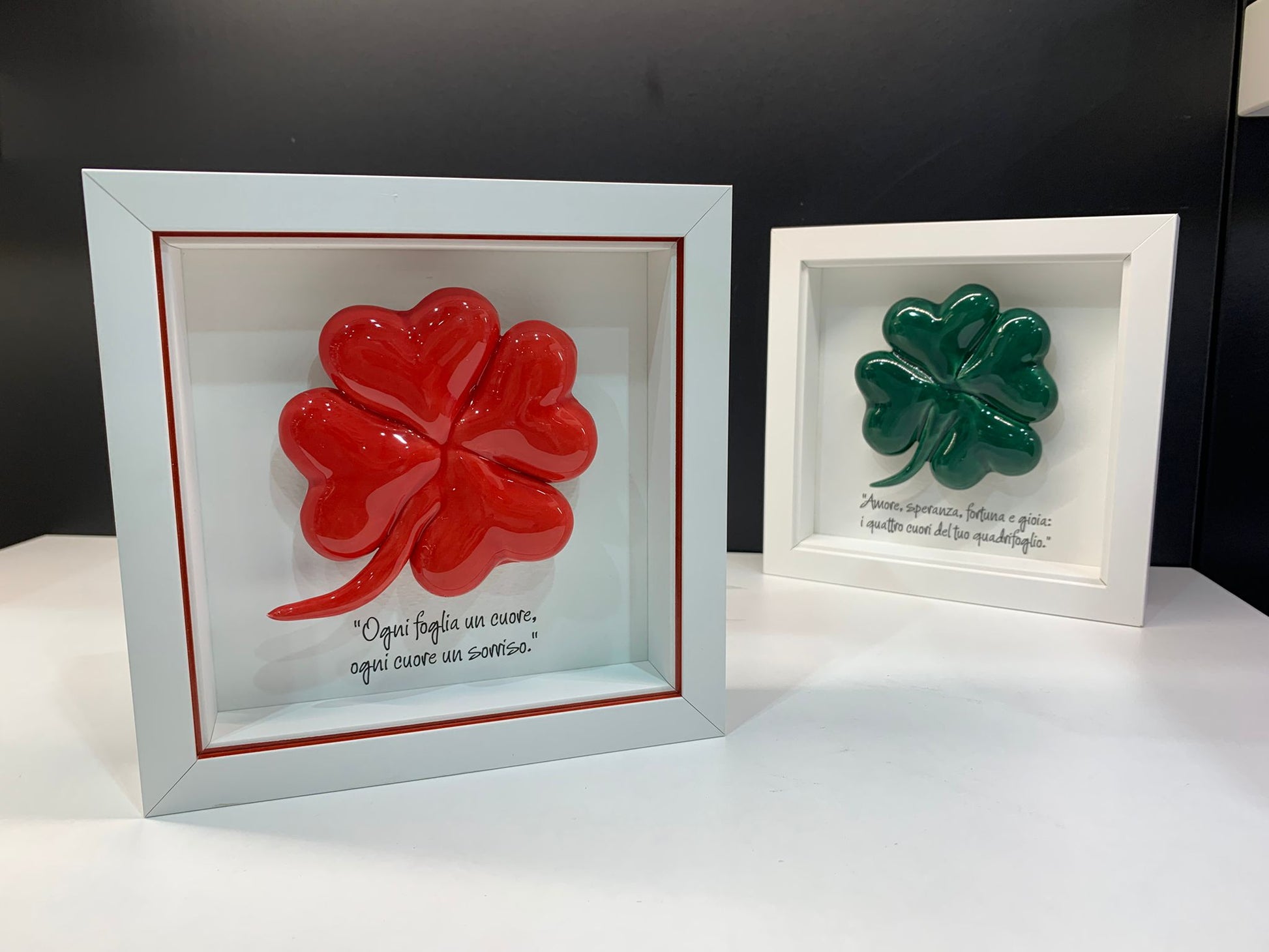 Il quadrifoglio in ceramica dalle foglie a forma di cuore è racchiuso in una cornice in legno elegante, simbolo di tenerezza, affetto e buon auspicio.