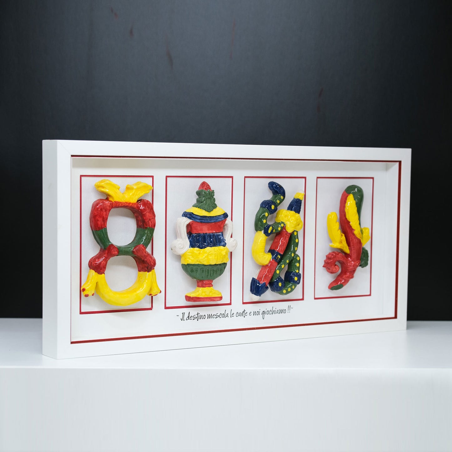 Quattro assi di ceramica artigianale raccontano la storia e la tradizione napoletana in questo esclusivo oggetto decorativo. La cornice in legno di abete bianco ne valorizza ogni dettaglio, trasformandolo in un vero e proprio pezzo d’arte da esporre con stile. A completare il tutto, una frase iconica della cultura napoletana, personalizzabile a scelta per rendere questa creazione ancora più unica.