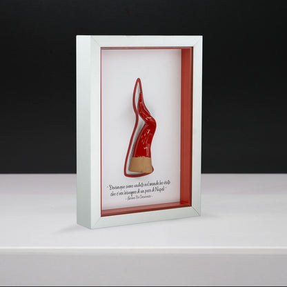Questo elegante oggetto decorativo artigianale, che raffigura un Corno rosso in ceramica, simbolo della tradizione napoletana. La cornice in legno di abete bianco lo incornicia con eleganza, creando un'opera d'arte da esporre. Accompagnato da una frase iconica della cultura napoletana. Questo pezzo unico è un must per gli amanti dell'artigianato e delle tradizioni locali. Un regalo prezioso da custodire gelosamente, racchiuso in un raffinato astuccio. Dimensioni: 16x22 cm