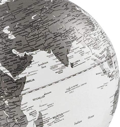 - Base in Acciaio Elegante: La solida base in acciaio dona stabilità al mappamondo e aggiunge un tocco di modernità, abbinandosi perfettamente alla sfera bianca e argentata.