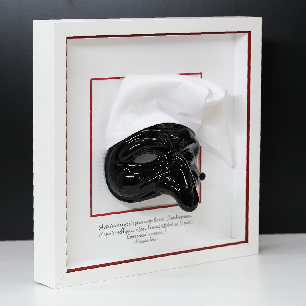 Questo elegante oggetto decorativo artigianale, che raffigura un Pulcinella nero in ceramica, simbolo della tradizione napoletana. La cornice in legno di abete bianco lo incornicia con eleganza, creando un'opera d'arte da esporre. Accompagnato da una frase iconica della cultura napoletana. Questo pezzo unico è un must per gli amanti dell'artigianato e delle tradizioni locali. Un regalo prezioso da custodire gelosamente, racchiuso in un raffinato astuccio. Dimensioni:23x23 cm