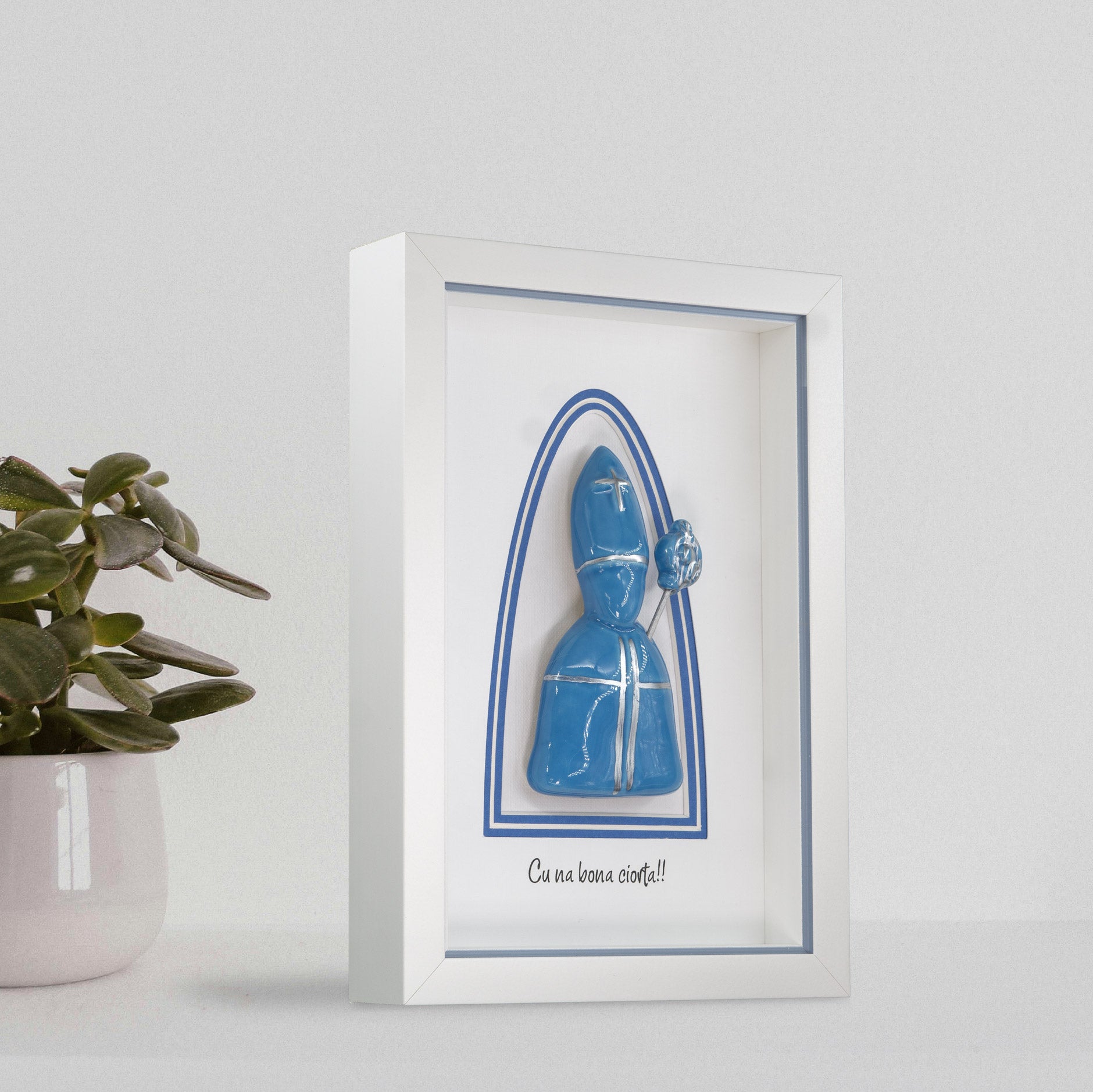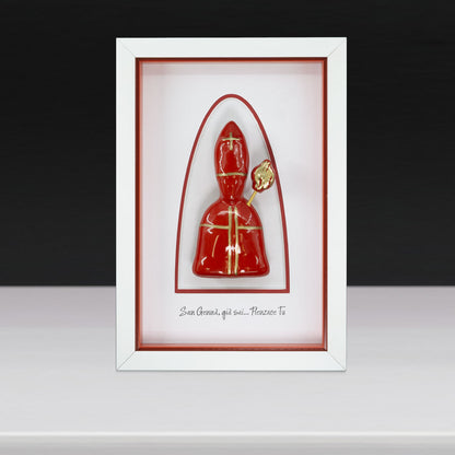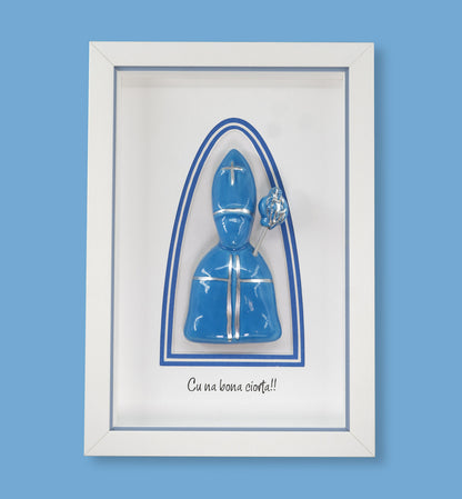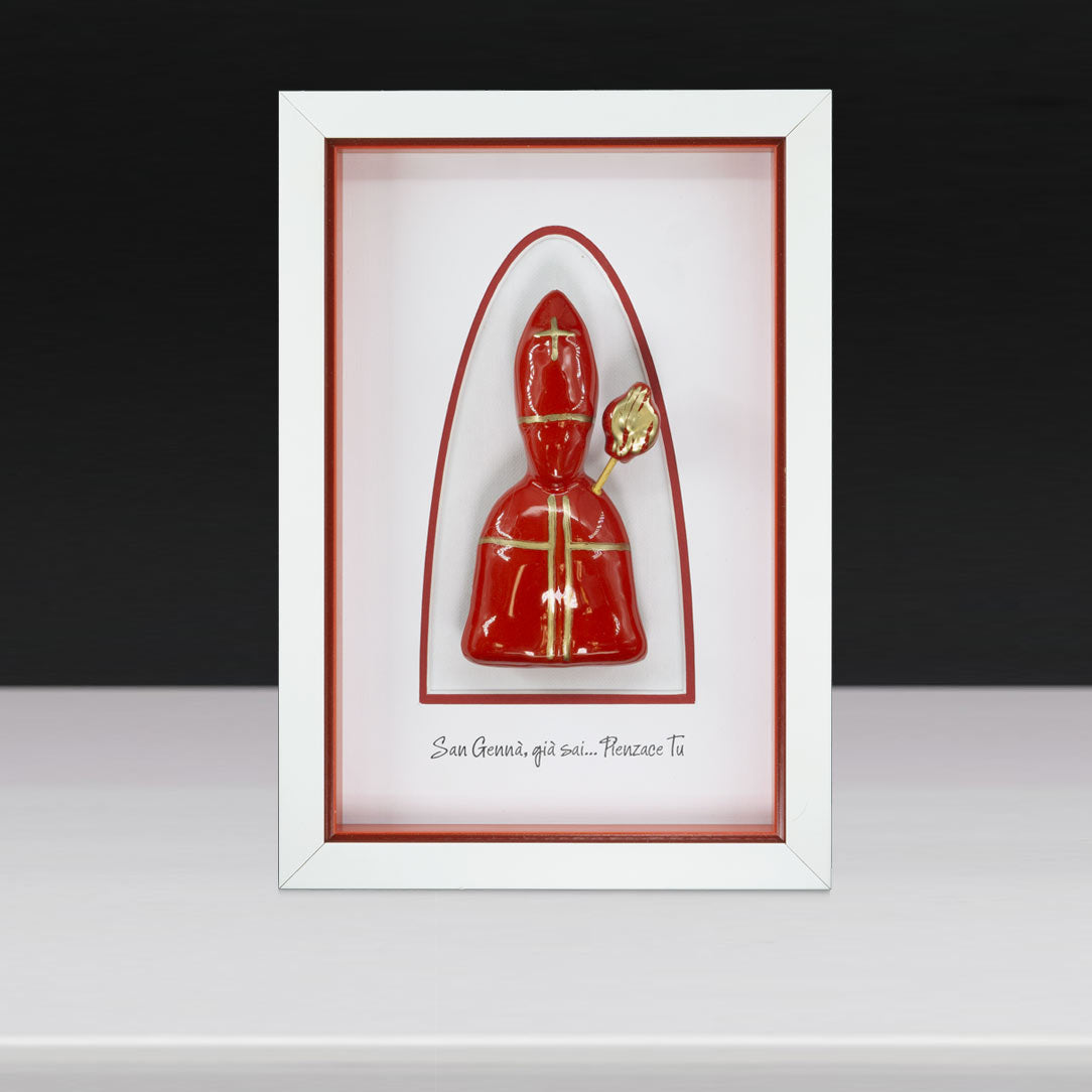 Questa iconica rappresentazione di San Gennaro, realizzata in ceramica dal vibrante colore azzurro Napoli, è valorizzata da una splendida cornice in legno disponibile in diversi colori, per adattarsi al tuo gusto e ambiente.