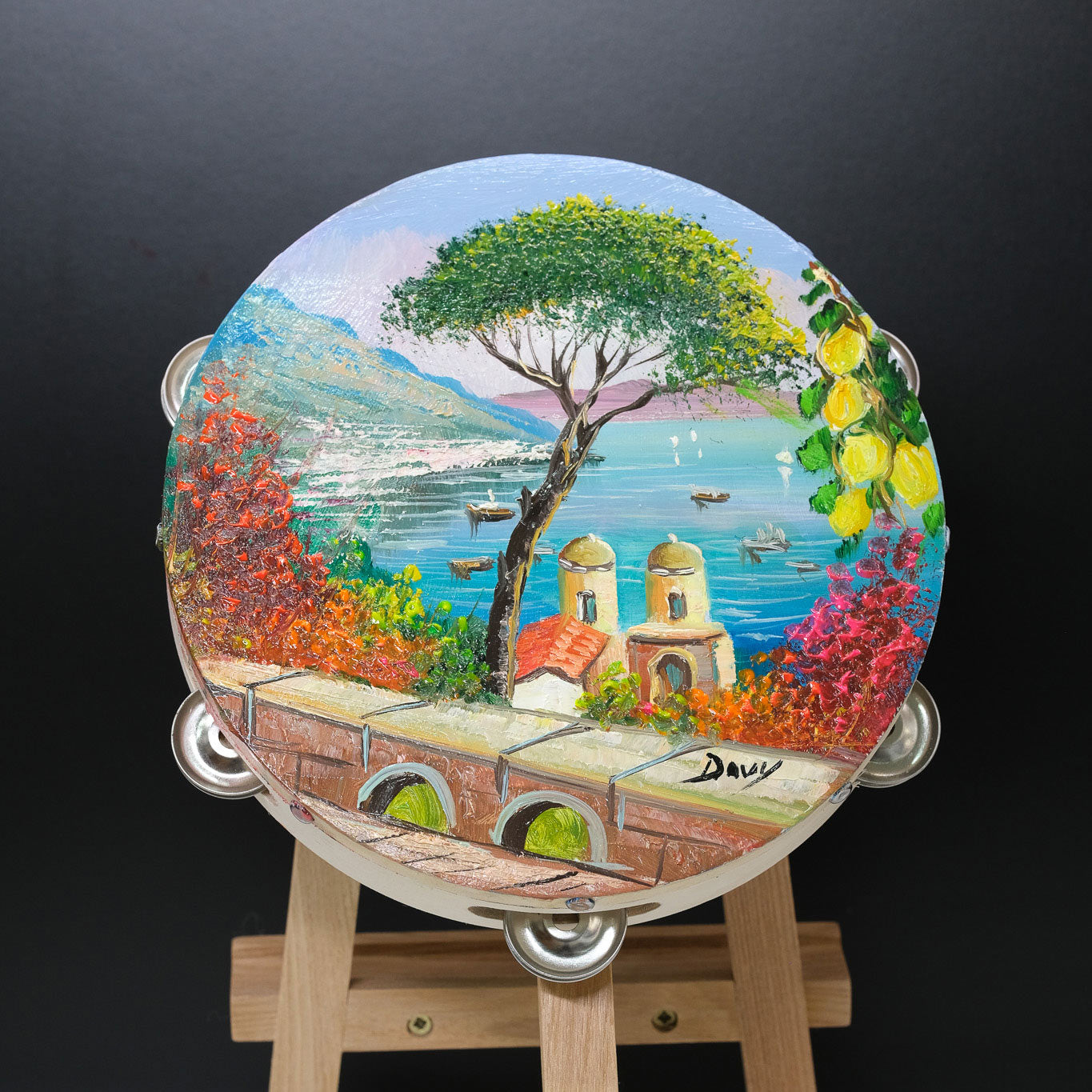 Aggiungi un tocco di tradizione e arte alla tua collezione con questo splendido tamburello dipinto a mano. Realizzato con la tecnica a olio su tela, raffigura un suggestivo panorama della Costiera Amalfitana, evocando i colori e l’atmosfera unica di questa perla del Mediterraneo.