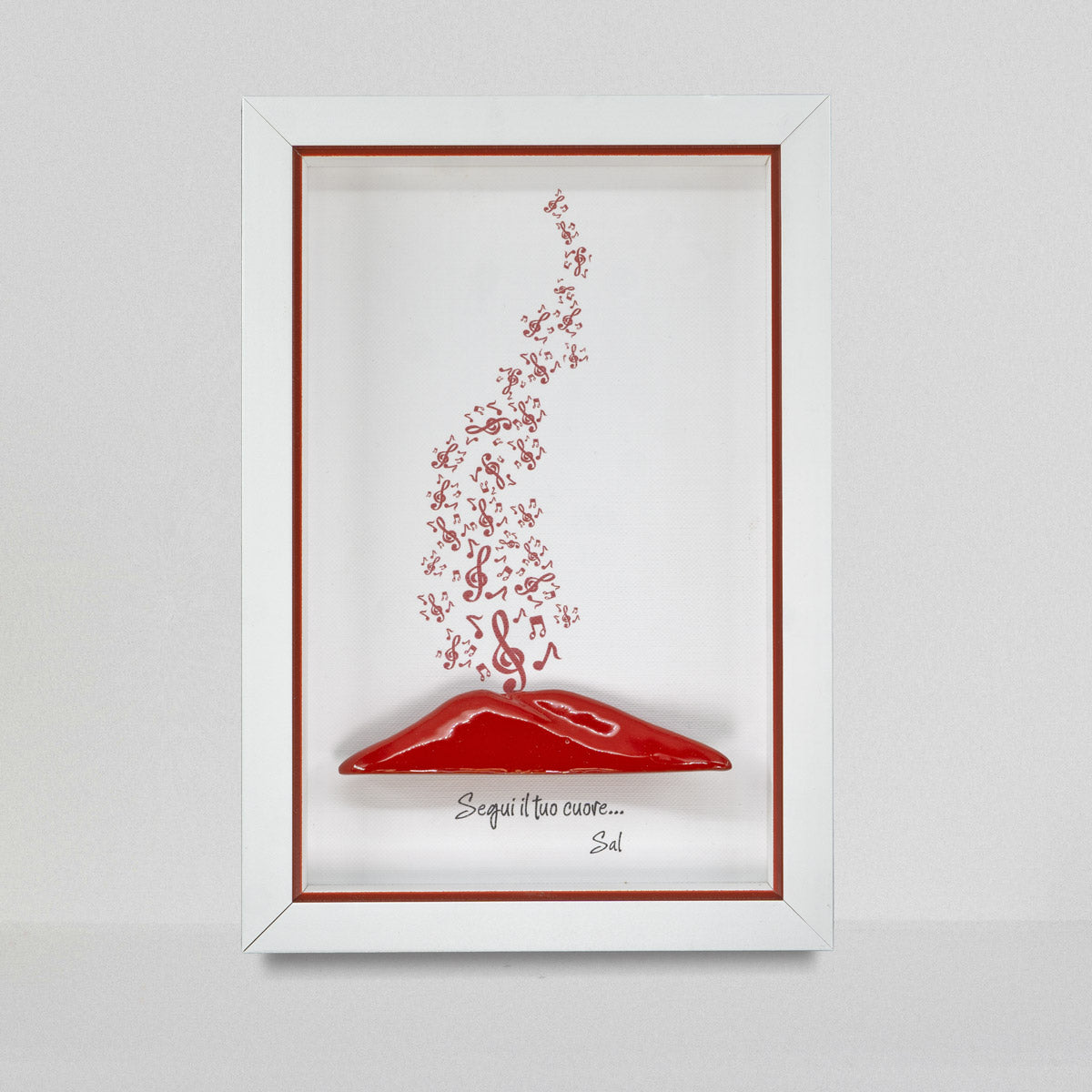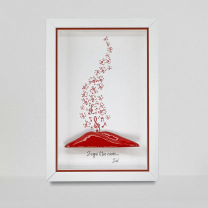 Un’opera artigianale che celebra il Vesuvio rosso con uno sbuffo di note, emblema della città di Napoli.